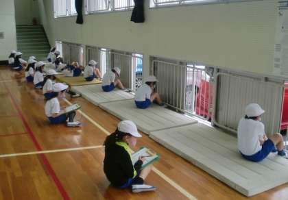 今日は3年生から6年生の新体力テストを行いました。クラスで協力し合って記録を書いたり、測定し合ったりして進めます。どの学年もしっかりできました。特に、5,6年生は1,2年生に教えたためか、とてもスムーズにできました。さすがです。この記録は年度始めのスタート地点です。これからどのくらい体力が高められるかが大事です。