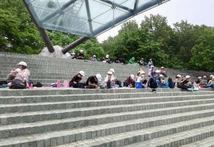 昆虫館は感染予防のため時間を区切って1校のみの貸し切りです。一通り見学した後、もう一度見たい所を自由に見て回ることができました。その後は楽しみなお弁当。おしゃべりしながら食べたいところですが、前を向いて食べます。この頃から雨が降り始め、残念ながら大室公園では遊ぶことができませんでした。