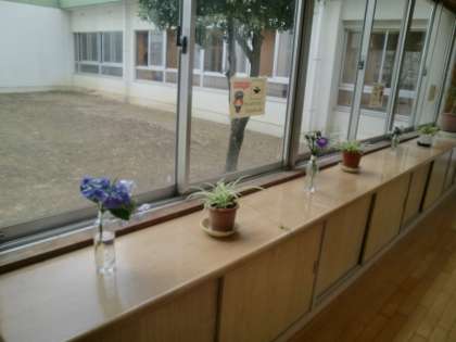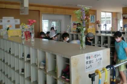 分けられた花は、児童玄関、廊下、流し、特別教室など、人目に付きやすい場所に飾られました。児童玄関では「わっー きれい!」という声も聞かれました。しばらくの間、花に囲まれた生活ができます。