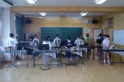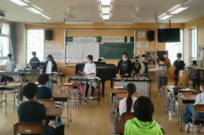 6年生の音楽 合奏の授業です。今日は担任の先生を招いての発表会です。これまで、グループで話し合いながら練習してきました。同じ曲でも、楽器の音色、強弱、打楽器のリズムなどによって、違ってきこえます。担任の先生も「楽しんで演奏していてよかった。いつもと違う面が見られた。」と、感想を言っていました。