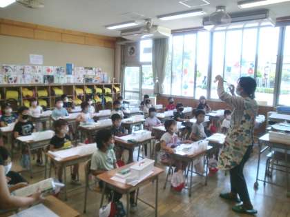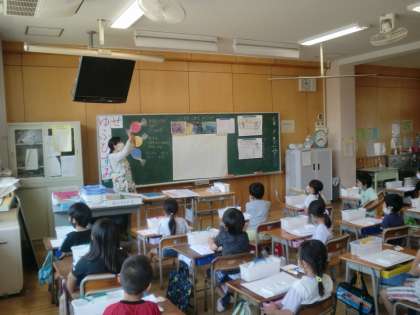1年生で講師の先生をよんで「絵の具講習会」を開きました。はじめて絵の具を使うので道具を置く場所から使い方まで丁寧に教えてもらいました。あじさいはしっかり塗れたかな。