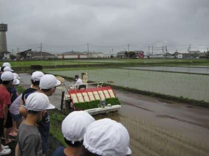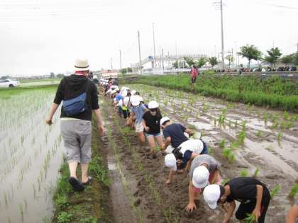 いよいよ田んぼに入っての田植えです。水と土の感触を味わいながら、手植えをします。苗は3〜5本ずつ植えると元気に育つ、と教えてもらい、糸に沿ってみんなで植えていきます。秋にはおいしいお米ができるかな。