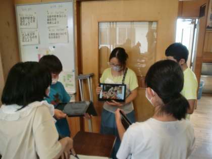 6年生の英語で、おすすめの国を紹介する活動をしています。タブレットを活用して、おすすめの国の国旗、名所、食べ物を調べ、写真を準備しました。個人、ペア、グループで練習し、最後は全員の前で発表しました。タブレットの活用も、英語での発表も慣れていてみんな堂々と表現できます。