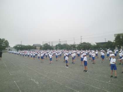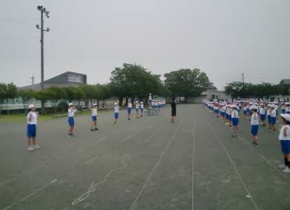 毎週水曜日に行っている体育集会。4月から行ってきたサーキット運動も一段落し、今日はラジオ体操をしました。体育委員が見本を見せたり、コツを教えたりします。朝の気温はさほど高くありませんが、湿度は80%以上です。熱中症予防のため、運動時はマスクを外し、間隔をとるようにしています。