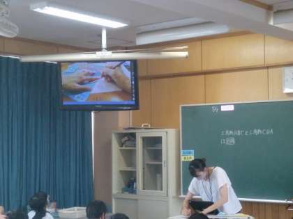 5年生2クラスを3つに分けて授業をしています。三角形の作図している先生の手元を大画面で映しながら、それを見て子どもも作図します。少人数なので、一人一人に寄り添いながら授業ができます。