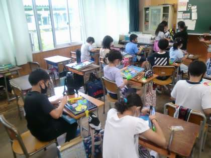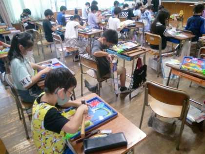4年生が図工でコリントゲームを作っています。今日は、「ゲームがおもしろくなるようにクギの打つ場所を工夫する」ことがめあてです。実際にビー玉をはじきながら、通り道を考えてクギを打っていきます。クギを曲がらないように打つのも大変です。みんな全集中で取り組んでいます。