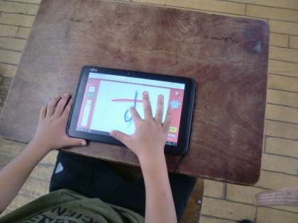 1年生でタブレットを使って、「指書きレッスン」をしています。このソフトは書き順が示されたひらがなを指でなぞり練習していくものです。ひらがなの復習に楽しみながら取り組むことができます。「また、やりたい!」という声も聞こえます。