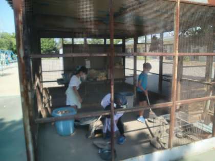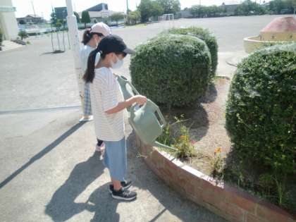 栽培委員さんは花のみずやり、飼育委員さんはうさぎ小屋の掃除と餌やりに順番に来てくれています。毎日暑い日が続きますが、花には水が必要で、うさぎには餌と水が必要です。当番さんのおかげで、花もうさぎも元気に夏を生きています。