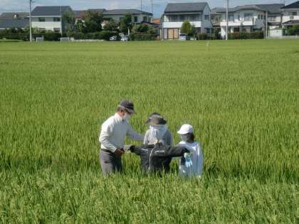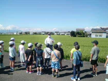 3年生が植えた田んぼの稲も大きく育ってきました。今日は、すずめから稲を守るために田んぼにかかしを立てに行きました。各クラスAグループで1つ、Bグループ1つかかしを作りました。羽鳥さんに、なんでかかしを立てるか、すずめは何を狙ってくるのかなどの説明を聞き、代表の子が立てに行きました。これで大丈夫かな? 明日はBグループが立てます。