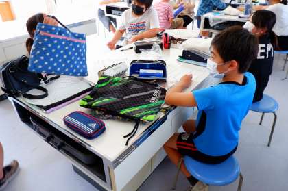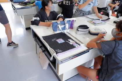 6年生の家庭科でナップサックを作りました。たくさんの種類の布から自分の好きなものを選び、ミシンを使ったり、針と糸を使ったりしながら作ります。作ったものを生活の中で実際に使うことも家庭科の目標です。これからたくさん使ってくださいね。
