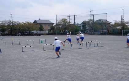 2つのハードルを越えていきます。めあては「遠くでふみきること」「2台目もスピードを落とさず超えること」です。高さの違うハードルや板の部分が開くハードルを置いたりして、ハードルを越える怖さを和らげる工夫をしています。「最後にもう1回跳んでみよう」と先生が言うと「やったー」と言う子どもの声が。目標をもって取り組んでいる証拠です。