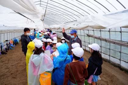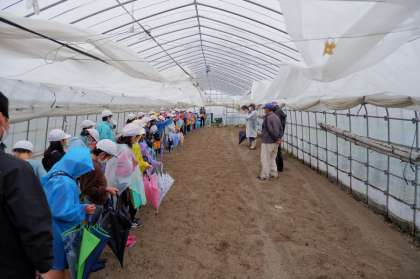 3年生が社会の授業で農家の見学にいきました。雨が降っていましたが、ビニールハウスの中で、農家の方から話しを聞いたり、質問をしたりしました。最後には抜いたばかりの大根をもらいました。