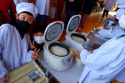 今日は6年生の2クラスが「あったかご飯給食」でした。これは、玉村産の米(あさひのゆめ)を特別に炊飯器で炊き、あつあつのご飯を食べてもらうという企画です。炊飯器を開けると「うまそー」という声があがっていました。他のクラスも、順番に行っていく予定です。
