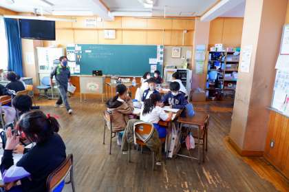 5年生が、来週に実施する社会科見学の計画をグループで話し合っています。めあてや役割分担などを決めます。欠席してしまった人もリモートで家から話し合いに参加しています。