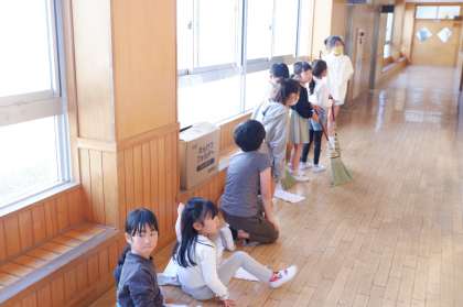 昼休みの後は掃除の時間です。学年があがると分担する場所も増えて、少ない人数でしなければなりません。一人一人の役割も重要です。1年生は最初のうちは6年生が手伝いに来てくれます。