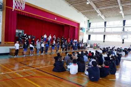 2月22日に発表できなかった3年生が、今日の朝行事の時間に全校の前で発表しました。全身を使って大きな声を出したり、3年になって初めてリコーダーを演奏したりして、とても見ごたえのある発表でした。6年生も喜んでくれたと思います。