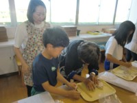 今日は三輪みちよ先生と一緒に伊勢作特別支援学校の生徒さんとの交流学習で使用する「上毛かるた」を粘土で作りました。三輪みちよ先生は指先で粘土の形を確認しながらアドバイスをしてくださいました。