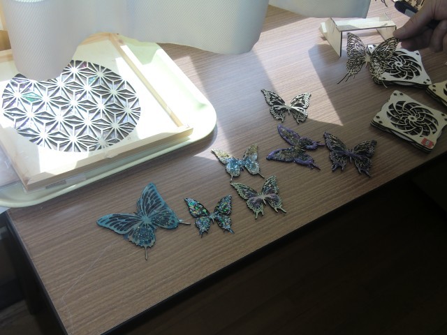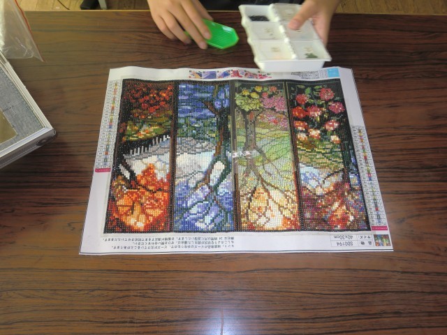 あおぞら教室にはたくさんの素敵な作品が飾られています。今日はビーズを一粒一粒丁寧に並べ、立体感のあるキラキラとした作品作りをしていました。また、レーザープリンターを活用した版画や壁飾りやランタンなど、まるで伝統工芸のような作品がたくさん並んでいます。ビーズや木の素材を活かして、この教室から新しい作品が生み出されています。次の材料は拾ってきたどんぐりです。この素材がこれからどのような作品に変身するかとても楽しみです。