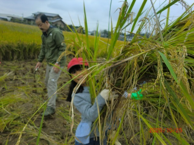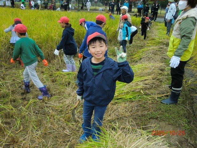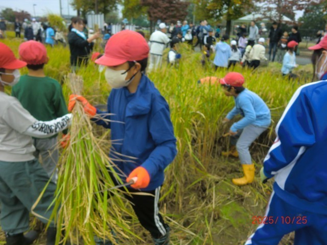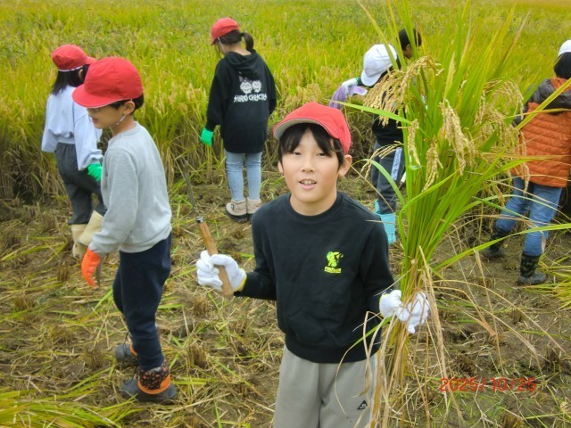 鎌をもち、稲穂を束ねながら丁寧に収穫をしていきます。ご参加いただいた保護者と共に、みんな夢中になり収穫の喜びを味わっていました。6月の田植えからこんなに立派に稲穂が成長し、自分たちの手で刈ることができるのはとても貴重で感動的 な体験です。これからお米をいただくときに、この経験を忘れずに大切に一粒一粒かみしめながら味わっていってくださいね。玉村町農業体験クラブの方々をはじめとし、関わっていただいた全ての方々に心より感謝申し上げます。ありがとうございました。