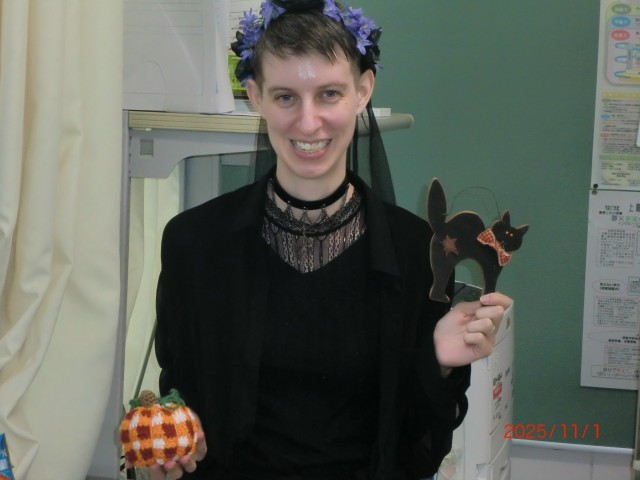 今日はハロウィン。ALTの先生は仮装した姿で校内で「Happy halloween!!」と、挨拶をしていました。「Happy halloween」とは「ハロウィンおめでと」「良いハロウィンを!」という意味の挨拶です。もともとハロウィンの日の仮装は、魔物から身を守るという目的があります。英語の授業でもみんなで変装をしてパレードを楽しみましたね。2枚目の写真のカボチャはALTの先生が編み物の作品です。今日は邪気を飛ばして、みなさんにたくさんの良いことがありますように!!