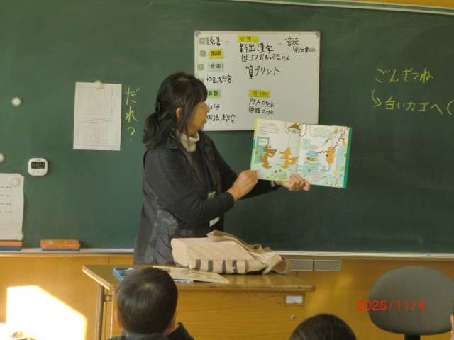 でんでん虫の会の読み聞かせが行われました。全校が本を通じ心温まるひとときを過ごすことができました。本の持つ素晴らしさは、一冊の本を通じ様々な体験や考え方を共有できることです。今日も様々な絵本の読み聞かせが各教委室で行われていましたが、どの教室もとても楽しそうでした。
