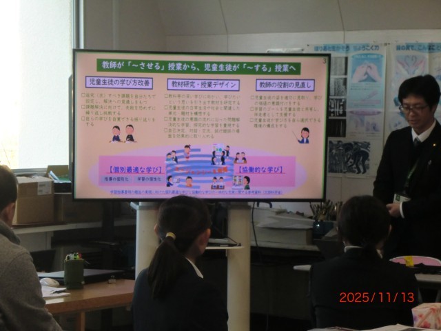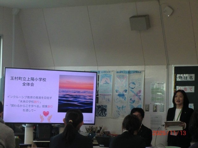 授業研究会の後は全体研修会が行われ、本校の校内研修についての説明、3校時の代表授業についてグループワークと、指導主事から指導助言をいただきました。本校の研修主題である「インクルーシブ教育の推進を目指す「未来の学校創り」から~「関わるからこそ学べる」授業創りを通して~」に向けた共通理解と深い学びのある1日でした。中部教育事務所及び玉村町教育委員会の先生方、ご指導ありがとうございました。