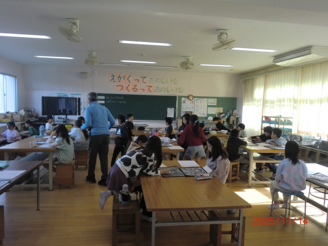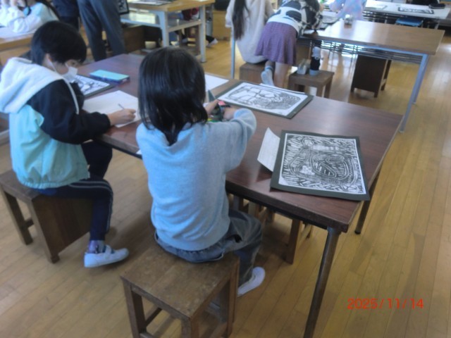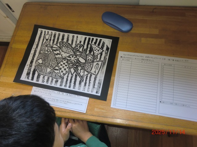 4年生の図工の授業では「もよう木はんが」に挑戦していました。めあては「全員かんしょうをする」でした。全員の思いのこもった作品にコメントを書いていきます。良さやアドバイスなど、たくさんのメッセージが書かれていきます。作品は校舎内に掲示しますので、クラス以外の作品も是非鑑賞してみてくださいね。