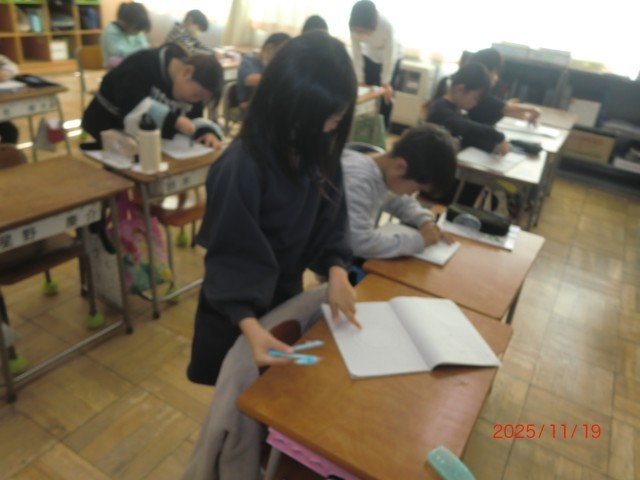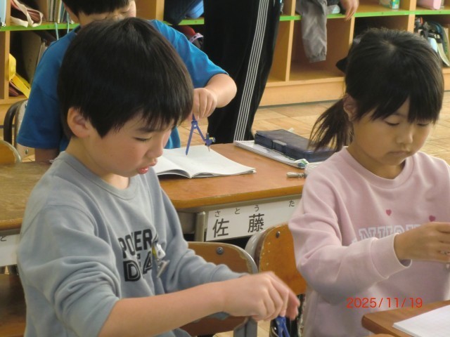 3年生の教室でコンパスの使い方を練習していました。どうしたらきれいな円になるか考えながら一生懸命取り組めていました。