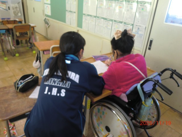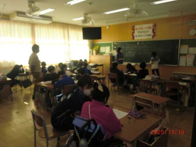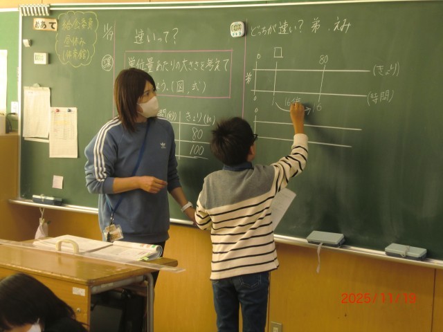 高学年の算数では速さを求める勉強をしていました。二つの速さを比較しながら様々な考え方を共有し、共に学び合う姿がたくさん見られました。