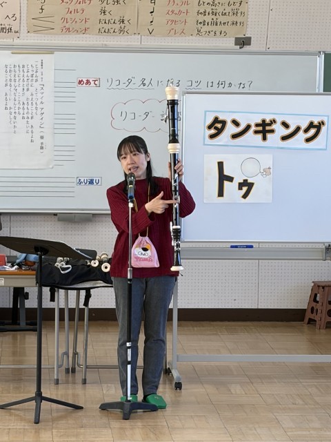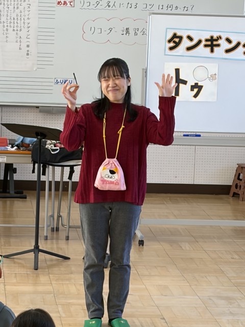 本日4校時の音楽時の時間に、「東京リコーダー協会」より講師の先生をお招きしリコーダー講習会が行われました。「リコーダー名人になるためのコツは何かな?」をめあてに、タンギングや運指の奏法のアドバイスの他に、講師の先生が多様なリコーダーの特徴を生かしてたくさんの楽曲披露してくださいました。曲目は小学生が大好きなジブリ映画トトロから「さんぽ」、鬼滅の刃から「炎」、Creepy Nutsの「 Bling-Bang-Bang-Born」など、演奏が始まるとみんな歓声をあげて、リコーダーに合わせて自然と歌い始めたり踊ったりして、その音楽の世界観に浸っている様子でした。東京リコーダー協会様、今日は遠方から上陽小学校にご来校いただきありがとうございました。とても楽しい講習会でした♫