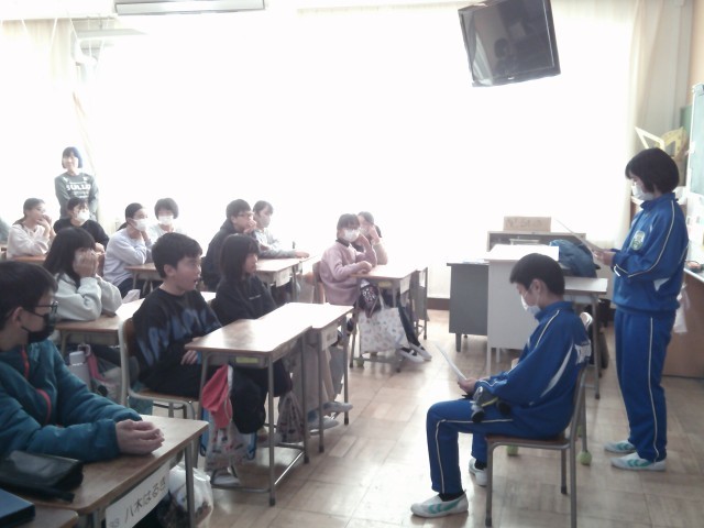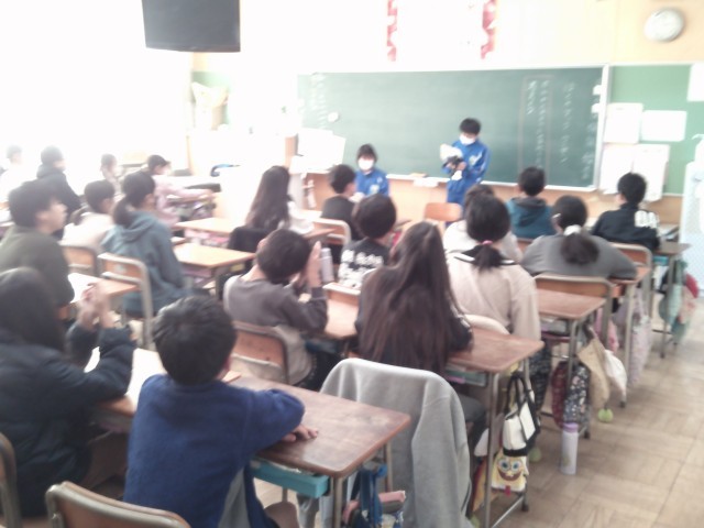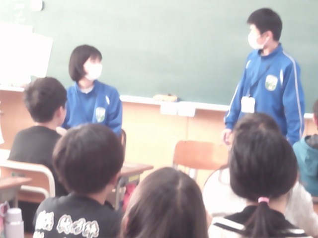 12月2日~4日までの3日間、玉村中学校の生徒2名が本校で職場体験を行いました。最終日は6年生に中学校生活の説明をしてくれました。「勉強」「生活」「部活動」「行事」などについて小学生からたくさんの質問に丁寧に答えてくれました。直接お話がたくさん聞けたので、中学校のイメージが具体的に描けたのではないかと思います。授業中や休み時間などもたくさん触れあい、小学生も中学生をとても慕っていました。6年生は中学校に入学し頼もしい先輩との再会が楽しみですね。