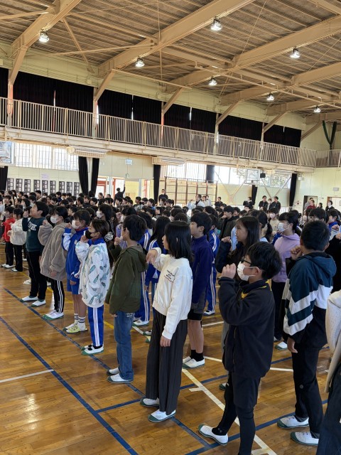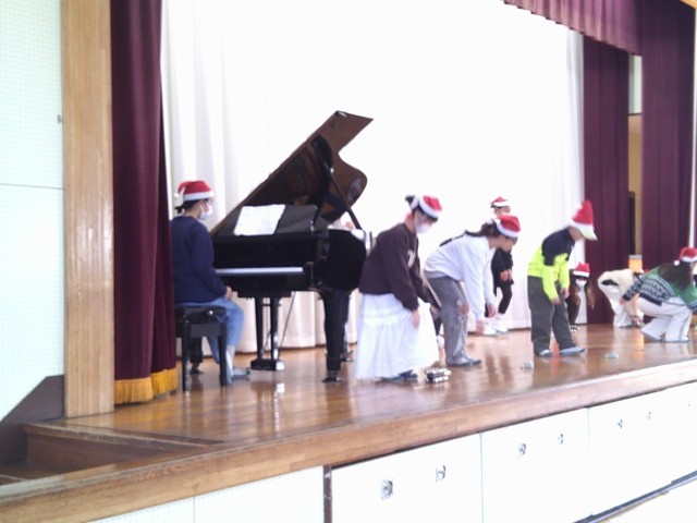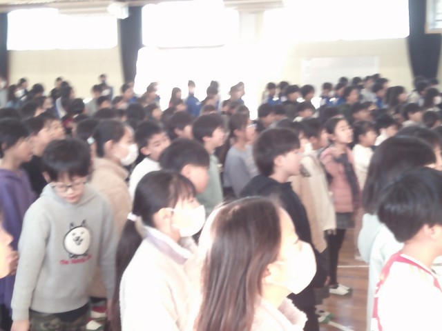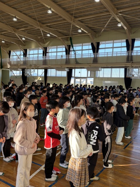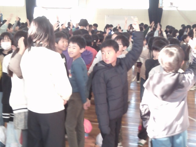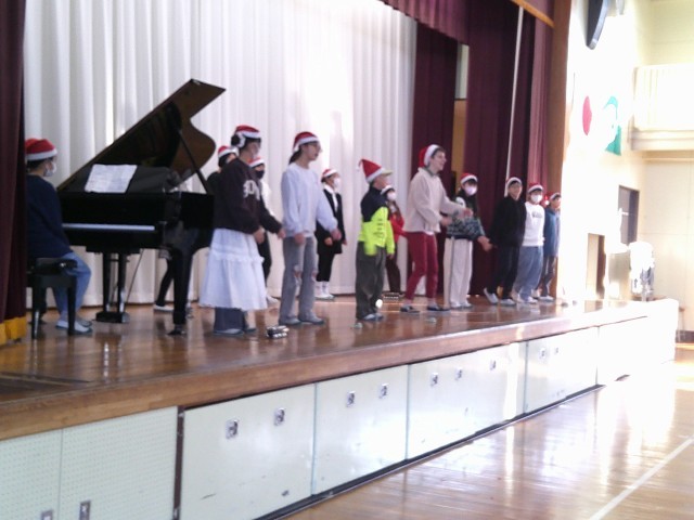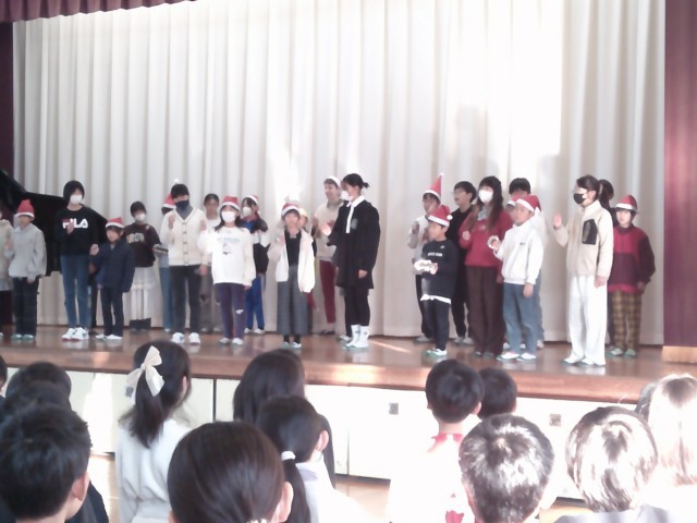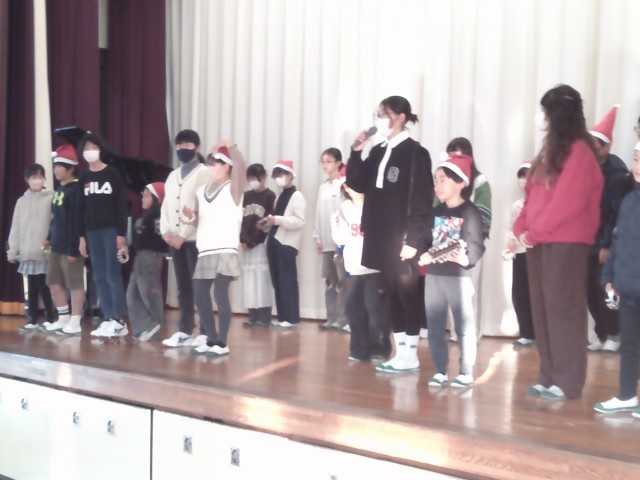 今日の音楽集会は「英語の歌とクリスマス・ソングを楽しく歌おう」をテーマに「This is the way」と「赤鼻のトナカイ」を全校で歌いました。今回はALTの先生もステージに上がり、英語と手話、そして振り付けも加え、たくさんの要素を取り入れた充実した内容となりました。「赤鼻のトナカイ」では音楽集会実行委員さんが打楽器で合奏のお手本を示した後、挑戦したい人を募りました。呼びかけにたくさんの児童が「はい!」と立候補し、体育館は大盛り上がりとなりました。音楽集会実行委員さん、全校が笑顔になる楽しい企画をいつもありがとうございます。