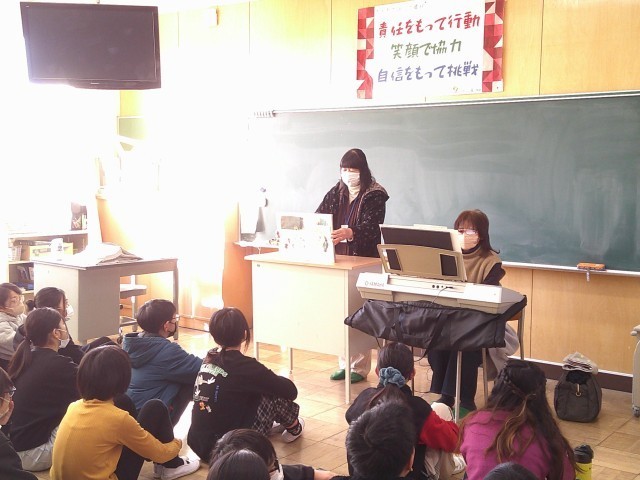 今日の読み聞かせも全校児童が本の世界に浸る幸せなひと時を過ごすことができました。6年生の教室は「からすたろう」のお話でしたが、紙芝居にキーボードによるオリジナルの音楽が加わり、物語の世界観も彩りを与えていました。「からすたろう」のお話は、学校に居場所が見つけられず寂しい思いを抱えながら過ごしていた主人公が、新しい先生との出逢いをきっかけにカラスの鳴き声を真似る才能を見いだされ、周囲からの認識が変わっていく物語です。6年間のお祝いの気持ちを込めて、ボランティアの方が心のこもったお話と素敵な演奏をプレゼントしてくださいました。感動的な時間をありがとうございました。