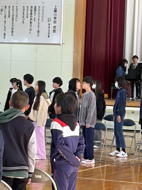 5、6年生による音楽集会が行われました。今日の集会は卒業式に向けた「国歌」「校歌」の練習でした。6年生はもうすぐ小学校を巣立ちますが、お世話になった方々への感謝や中学生になる覚悟、5年生に上陽小学校を任せた!という気持ちや、5年生は6年生への感謝の気持ちやエールが届くような感動的な歌になる予感がします。卒業式までの限られた時間を大切に、みんなで力を合わせて素晴らしい卒業式にしましょう。