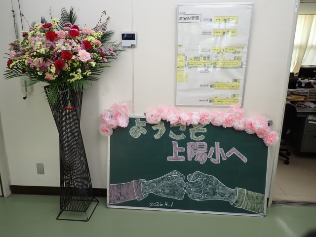 職員玄関にはコラボレーターさんが4月1日に描いてくださった黒板アートが飾られています。
