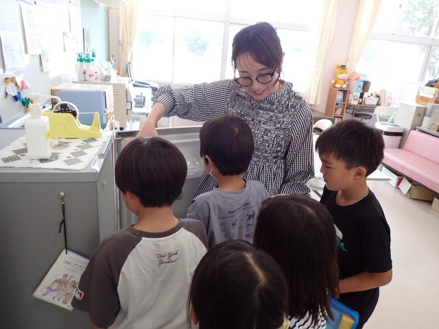 次の保健室をのぞくと養護の先生にインタビューする児童が集まっていました。