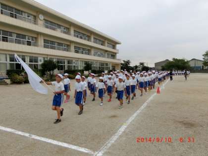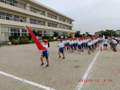 今日の全体練習は、入場行進の練習です。練習開始の時間には、きちんと入場門に集まれていました。昨年度優勝した白組を先頭に、高学年から行進します。さすがに旗手の代表委員や団長さんは堂々とした行進です。低学年は、前の人を追い越さないように、後ろに追いつかれないように歩くのが精一杯のようです。「第1日目にしては、しっかりできましたね。」と指導の先生からお褒めの言葉をいただきました。