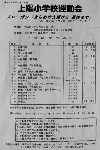 9月27日(土)に予定されている第68回上陽小学校運動会のプログラムが発表されましたのでお知らせします。「予定時刻」については、天候や会場の状況、児童たちの体調管理等により変更がありますので、あらかじめご了承ください。