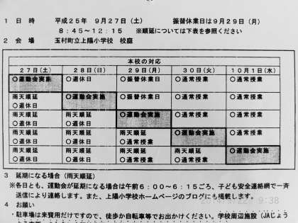 16日付で、ご家庭に通知した「雨天順延の場合」の表を掲載します。