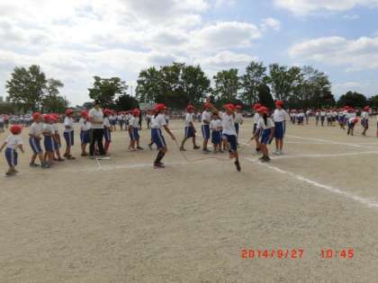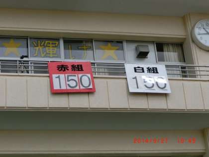 9月27日(土) 運動会(2) 公開日 2014/09/27 更新日 2014/09/27 学校行事 前半戦を終わり、現在紅白ともに150点で同点です。応援合戦にも力が入ります。 後半戦の最初は、縦割り班による「長縄跳び」です。これも、紅白対抗の得点になります。