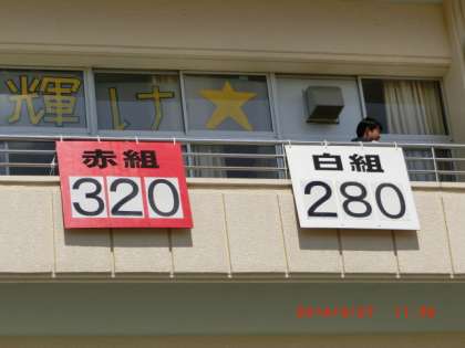 現在の得点は、赤組=320点 白組=280点 となっています。このまま赤組が逃げ切るのか?白組が追い上げ、逆転となるのか?ますます応援に熱気がこもります。