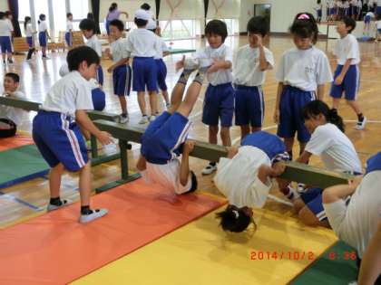今日の運動集会は、低・中・高の3つの学年ブロックに児童たちが分かれて、それぞれ体育館と校庭を使い『○○ができるようになる特別練習(仮)』と称した運動を行いました。校庭では、スタートダッシュなどを中心に体育館内では器械運動につながる動きを体験しました。
