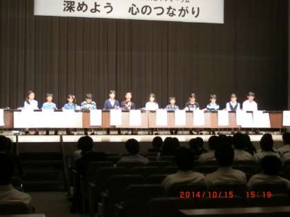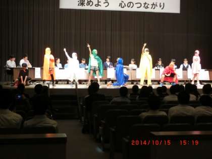 夏の中体連の大会で活躍した中学生の表彰や姉妹都市のUSAのワシントン州エレンズバーグに研修に行った中学生からの報告、玉村中学の合唱の披露、人権作文・少年の主張など玉村町の中学生の活躍が次々と紹介される中、町内の5つの小学校の代表による『パネルディスカッション いじめを許さない学校をめざして 』に、上陽小の6年生が2人参加しました。本校の取り組みの紹介では、ルールレンジャーレインボー+1も登場してくれました。
