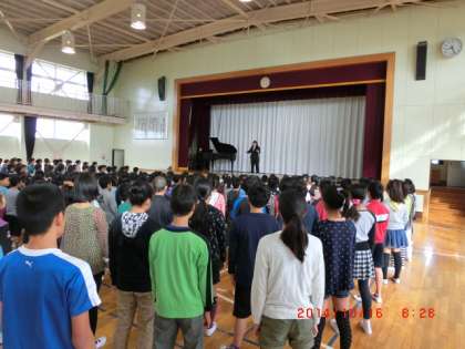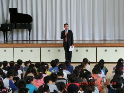 スタートにあたり、体育館で『後期始業式』を行いました。儀式は節目とは言いますが、児童たちの気持ちの中にも何らかのけじめがあるようで、後期の始業式を再スタートと受け止め、少し神妙な表情です。校長先生から『後期は、友達との言葉遣いにも気をつけましょう』と目標が示されました。