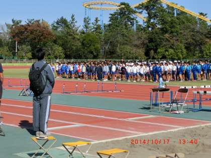 午前中の日本晴れから一変、肌寒さを感じる深秋の気配になった伊勢崎陸上競技場で、玉村町の5つの小学校から集った300名余の児童たちが、今までの陸上競技練習の成果を競いました。