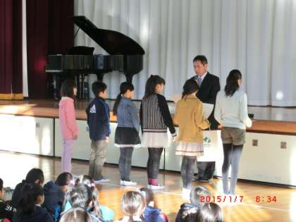 今日の朝礼は、昨年12月にグリーンクロスジャパンより表彰された環境日記の取り組みの学校賞の紹介と、個人賞の伝達から始まりました。年明けに全国規模の表彰を受け、今年も児童たちの活躍するよい年になりそうです。
