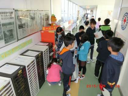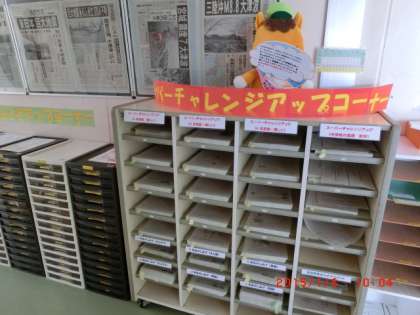 職員室前に置かれた学習プリントから、児童個々の課題に応じたものを選ばせ、自主的に取り組ませています。自己採点をもとに、チャートにしたがって次の段階に進んだり、復習のプリントに戻ったりと、1部、学年を超えた取り組みができるようにも工夫されています。