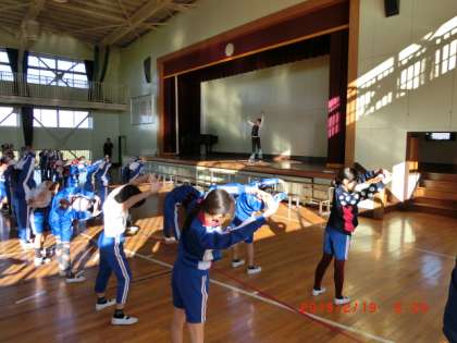 校庭のコンディションが悪いため、今日の運動集会は体育館で行いました。音楽に合わせて柔軟体操をしたり、体を大きく使ってジャンケンをしたりして、楽しく運動できました。