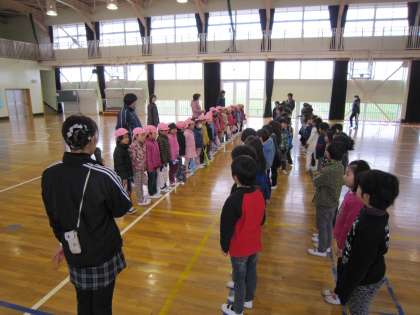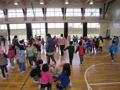 ■1年生の子ども達と第3保育所の年長さん達とで仲良く遊ぶ「なかよし交流会」を実施しました。冬に逆戻りしたような寒い日でしたが体育館で楽しく遊びました。まず最初に挨拶をして、はじめに1年生から6年生を送る会で発表したはらぺこ青虫さんの歌を見せました。次にグループ作りゲーム、音楽に合わせて体育館を歩いて、音楽がストップして太鼓の数を数えてその数のグループを作ります。一緒になったらご挨拶をきちんとします。そして、1年生の教室を見学してから図書室にも行きました。約1時間の短い時間でしたがとっても楽しい交流ができました。四月の入学を待っています。