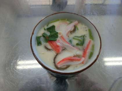 給食センターよりお二人の栄養士さんに講師として来ていただき、児童でも簡単にできるおやつメニューを教えていただきました。今日のレシピは、『茶わん蒸し』です。和食の定番メニューですが、きれいに作るには多少の腕を必要とする料理です。